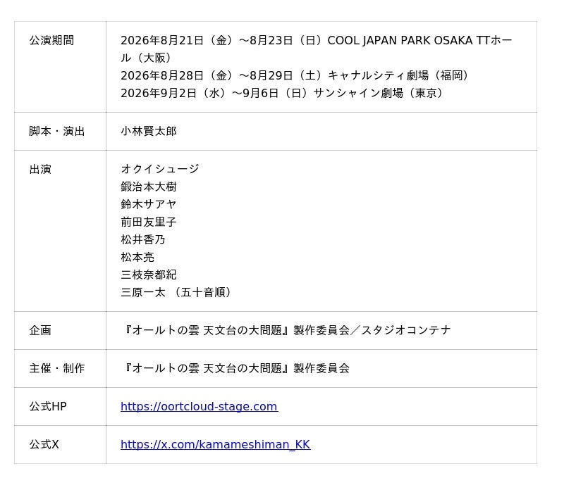 株式会社HIKE(本社:東京都新宿区、代表取締役:三上政高)は出資・製作する、劇作家、小林賢太郎氏の新作オリジナル舞台『オールトの雲 天文台の大問題』が、2026年8月~9月に大阪、福岡、東京にて上演決定したことをお知らせいたします。