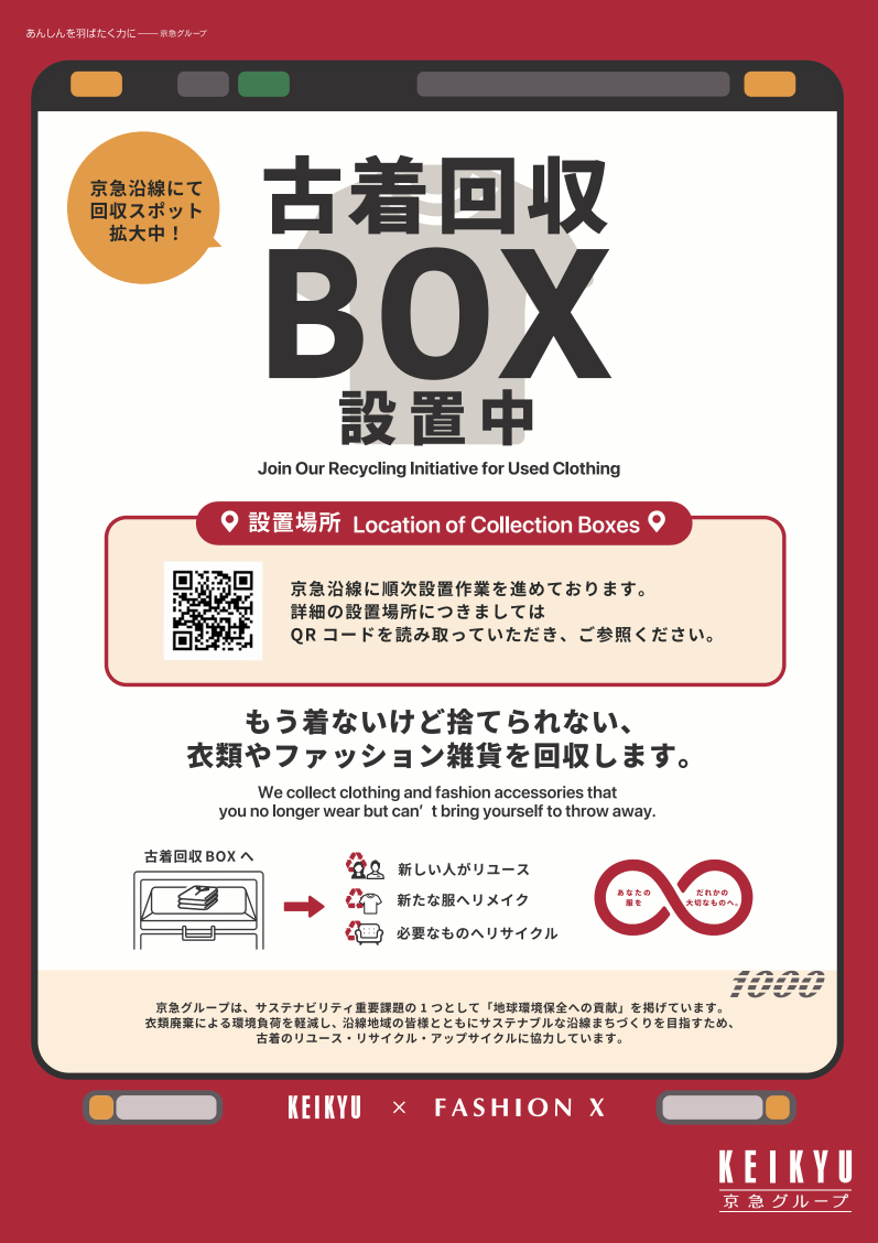 1.概 要京急沿線の駅やグループ施設等において,専用のボックスを設置し,衣類や古着の回収を実施しています。回収した衣類は,リサイクル品として転用していくほか,今後,沿線の様々な場所でリユース品として地域に循環させる仕組みをつくります。将来的には,様々なクリエイターなどと連携したアップサイクル商品の開発・販売や,駅前広場や地域交流拠点を活用したイベント等を行うことで,沿線地域における衣類・資源循環の新たなプラットフォーム構築を目指します。