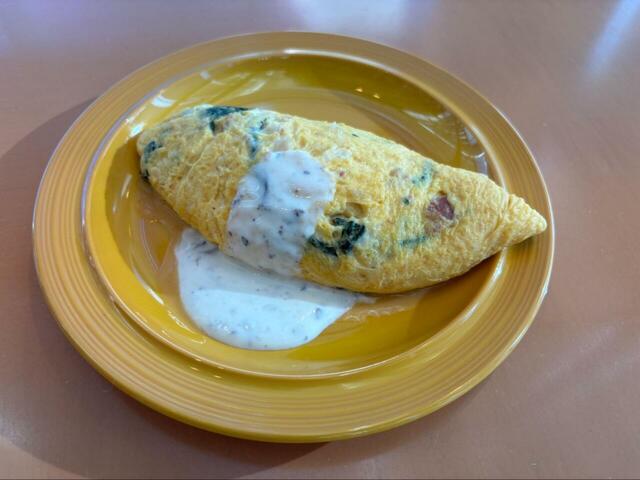 焼きたてのオムレツにナイフを入れると、中はとろりとした半熟。ほうれん草の食感、ベーコンの旨み、とろけるチーズ、そしてトリュフ香るクリームチーズソースが一気に広がって、「いや、これは…朝から反則級のごちそうだな」と思わず心の中でつぶやくほど。