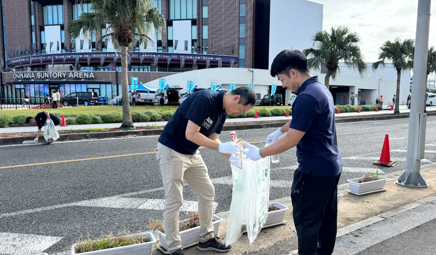 沖縄アリーナ社・沖縄バスケットボール社のグループ総勢57名が、市内4自治会に分かれて清掃活動へ参加しました。