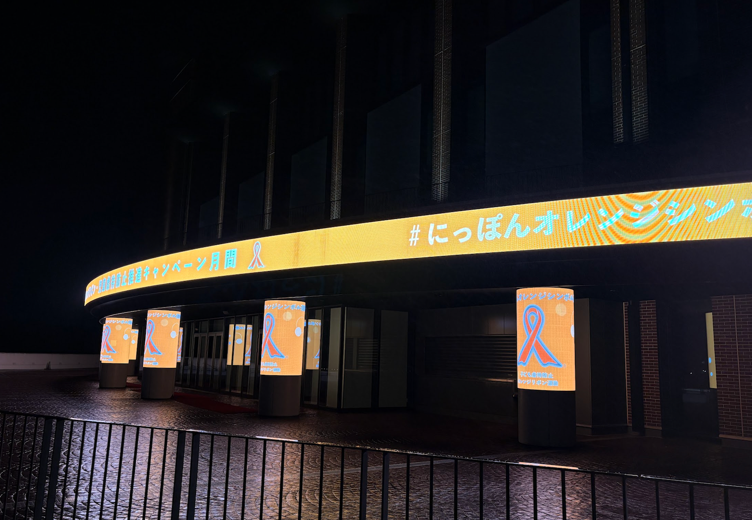 外壁ライトアップおよび啓発メッセージ掲出を行い、地域の健康意識向上に寄与しました。