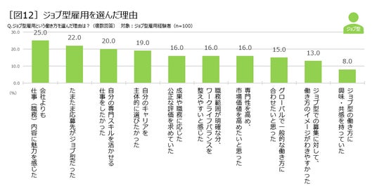 ここからは、現在ジョブ型雇用で働いている、または働いたことがあるジョブ型雇用経験者100人に聞きました。ジョブ型雇用という働き方を選んだ理由を聞くと、「会社よりも仕事(職務)内容に魅力を感じた」(25.0%)、「たまたま応募先がジョブ型だった」(22.0%)、「自分の専門スキルを活かせる仕事をしたかった」(20.0%)が上位に挙げられました[図12]。
