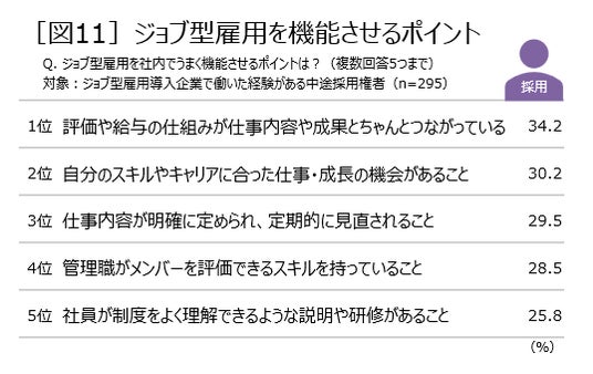 ジョブ型雇用を社内でうまく機能させるためのポイントを聞くと、「評価や給与の仕組みが仕事内容や成果とちゃんとつながっていること」(34.2%)、「自分のスキルやキャリアに合った仕事・成長の機会があること」(30.2%)、「仕事内容が明確に定められ、定期的に見直されること」(29.5%)が上位に挙げられました[図11]。
