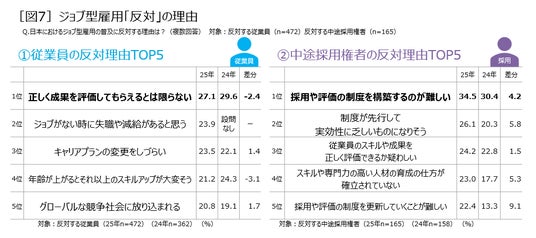 反対理由 従業員「正しく評価してもらえない」、中途採用権者「採用・評価制度の構築が難しい」