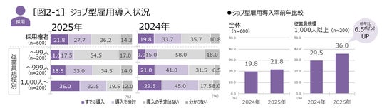 2024年の調査結果と比べると、全体の導入率は19.8%から21.8%と2.0ポイントの増加ですが、従業員規模1,000人以上の企業では29.5%から36.0%と6.5ポイント増え、ジョブ型雇用の導入が一層進んでいます[図2-1]。