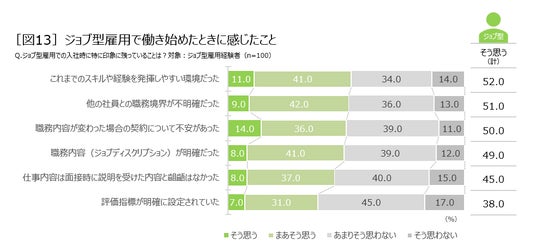 また、ジョブ型雇用での入社時に印象に残っていることを4段階(そう思う、まあそう思う、あまりそう思わない、そう思わない)で聞くと、約半数が「これまでのスキルや経験を発揮しやすい環境だった」(52.0%=そう思う11.0%+まあそう思う41.0%)と良い印象を抱いています。一方、ほぼ同数が「他の社員との職務境界が不明確だった」(51.0%=そう思う9.0%+まあそう思う42.0%)、「職務内容が変わった場合の契約について不安があった」(50.0%=そう思う14.0%+まあそう思う36.0%)と不安を感じています[図13]。