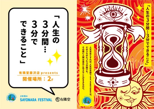 株式会社有隣堂(本社:横浜市中区、代表取締役 社長執行役員:松信 健太郎)は、2026年1月5日(月)~2月11日(水・祝) にかけて、「有隣堂 藤沢店」にて企画展「人生の3分間・・・3分でできること」 を開催いたします。本展は、藤沢店の閉店までの2年間を “未来の書店を試す社会実験期間” と位置づけた「SAYONARA FESTIVAL」シリーズの第2弾です。