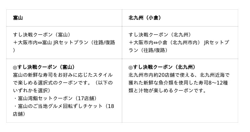 「大阪市内⇔富山or北九州(小倉)のJRセットプラン(往路/復路)」と「現地すしクーポン」がセットになった、超お得な"すし決戦きっぷ"が期間限定で登場します。