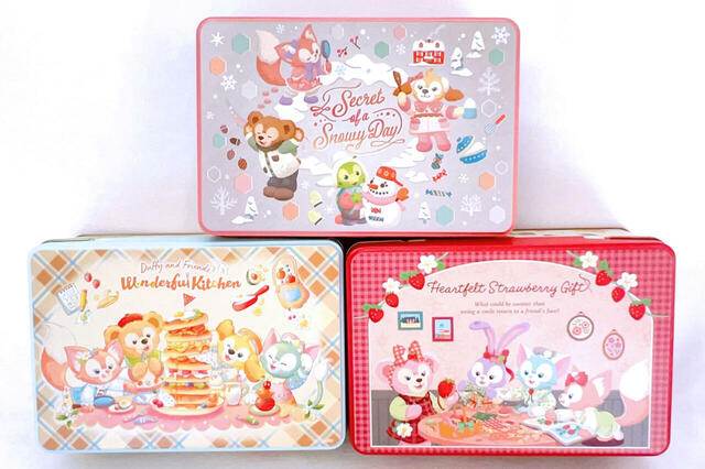 どちらも、ダッフィー、クッキー・アン、オル・メル、リーナ・ベルの4人が雪の日を楽しんでいる様子が描かれた、可愛さあふれるアートのパッケージです。