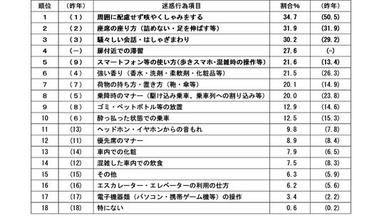 そのほかの順位ついては、「座席の座り方(詰めない・足を伸ばす等)」「騒々しい会話・はしゃぎまわり」がそれぞれ昨年度と同様に2位、3位にランクインしました。