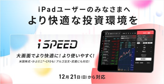 楽天証券株式会社(本社:東京都港区、代表取締役社長:楠 雄治、以下「楽天証券」)は、2025年12月21日(日)より、スマートフォン向けトレーディングアプリ「iSPEED(R)」をiPad(R)に最適化することをお知らせします。これにより、iPad(R)でも国内株式に加えて、米国株式や、「かぶミニ(R)(単元未満株取引)」、CFDの取引が可能になるほか、取引に必要な銘柄情報、チャート、注文画面などを一画面に最大3つまで表示できるなど、大画面をいかしたiPad(R)ならではの取引環境を実現します。