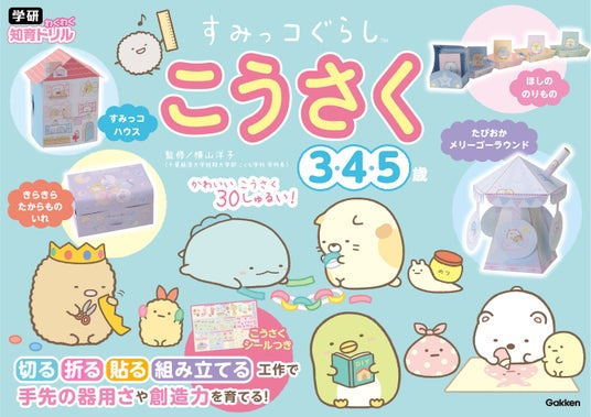 「学研わくわく知育ドリル すみっコぐらし」シリーズから、5冊目となる『すみっコぐらし こうさく 3・4・5歳』が発売されます。すみっコぐらしのイラストいっぱいの、はさみ・のりを使った工作で、切る・折る・貼るの基本を学び、“手先の器用さ”と“創造力”を育みます。