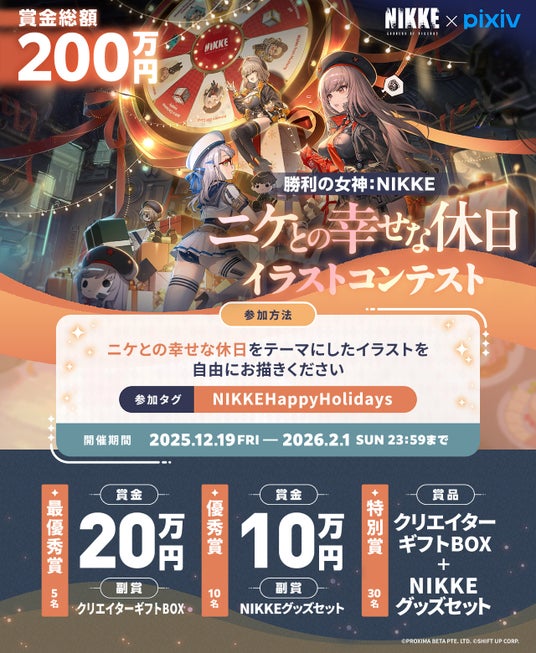 また、イラスト、マンガ、小説作品の投稿プラットフォーム「pixiv」では、勝利の女神:NIKKE「ニケと幸せな休日」イラストコンテストを2025年12月19日(金)より同時開催いたします。