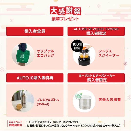 シトラススクイーザーを含む最大級のプレゼント贈呈購入後も安心の無料クリーニング&点検サービスクーポン付き 新年の健康&美のスタートに最適なキャンペーン