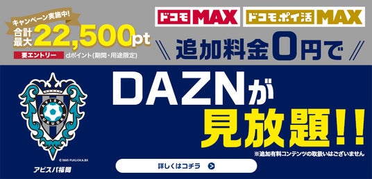 このたびアビスパ福岡は、株式会社NTTドコモとの協業により、「ドコモ MAX」「ドコモ ポイ活 MAX」ご契約者様を対象としたキャンペーン《第2弾》を実施いたしますので、お知らせいたします。また、本お知らせやアビスパ福岡指定バナー/URL経由でこの料金プランにお申込みいただくと、ご契約金額の一部がクラブへ強化費用として寄付されます。この機会に、ぜひキャンペーンにご参加ください。