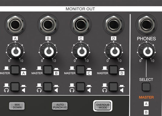- 個別のミックスバランスで、ヘッドフォンまたはスピーカーに出力できる5系統のモニターアウト