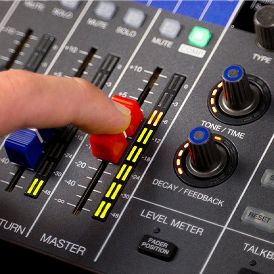 アナログ感覚で、直感的にコントロール各チャンネルに60mmストロークのフェーダーと、3つのチャンネルノブを装備。「チャンネルノブ選択キー」により、GAIN、COMP、EQ(LOW / MID / HIGH)、PAN、エフェクトセンドといった主要なパラメータを瞬時に割り当て、最短ルートで調整できます。ノブの周囲には、設定値と連動するLED表示を採用し、暗い会場でも全体のステータスを一目で把握できます。