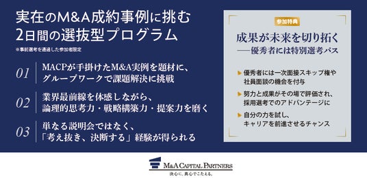 本イベントは「MACPを体感する春開催の就活イベント」として、実在のM&A成約事例を題材に、グループワーク形式で課題に挑む2日間の選抜型プログラムです。