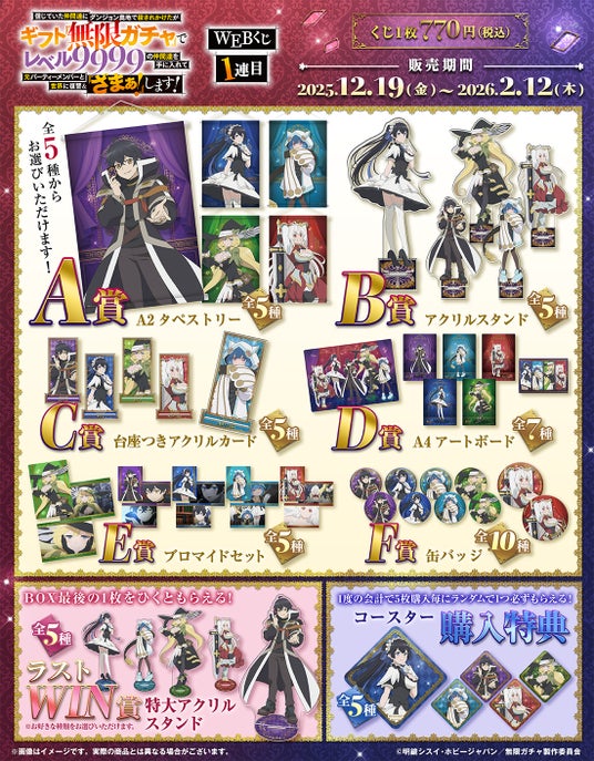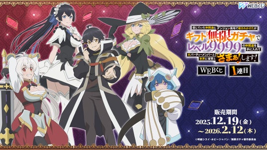 TVアニメ「信じていた仲間達にダンジョン奥地で殺されかけたがギフト『無限ガチャ』でレベル9999の仲間達を手に入れて元パーティーメンバーと世界に復讐&『ざまぁ!』します!」の新規描き下ろしイラストを使用したグッズが当たる、ハズレなしのオンラインくじです。