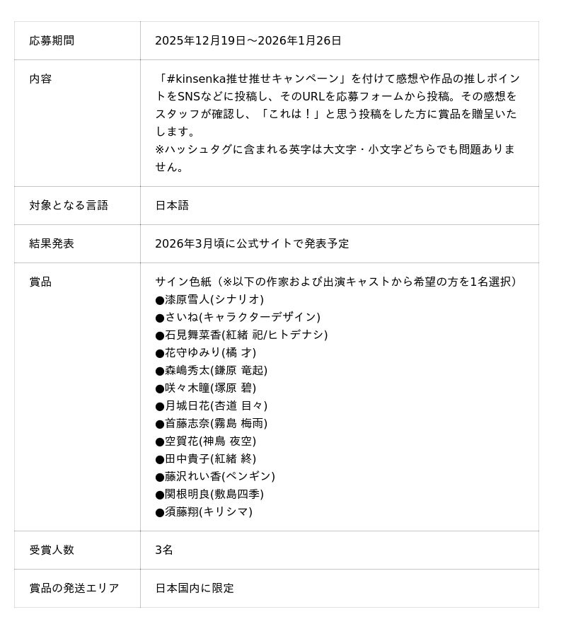 豪華声優&作家のサイン色紙が当たる!「Kinsenka推せ推せキャンペーン」スタート!