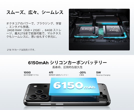 バッテリーには、6150mAh の大容量バッテリーを内蔵。通勤・通学や外出先での長時間利用にも対応し、充電回数をできるだけ減らしたいユーザーにとって大きなメリットとなります。 また、DOOGEE Note56 は SIMフリー仕様(キャリアロックなし)を採用しており、国内外の通信事業者の SIM カードを自由に利用可能です。さらに 4G デュアルSIMにも対応しているため、仕事用とプライベート用の回線を1台で使い分けるなど、多様な利用シーンに柔軟に対応します。通信キャリアに縛られない点は、通信費を抑えたいユーザーにとっても魅力的なポイントです。