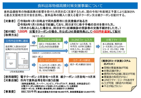 河内長野市では、食料品価格等の物価高騰の影響を受けた市民を広く支援するため、国の令和7年度補正予算により追加された重点支援地方交付金(正式名称「物価高騰対応重点支援地方創生臨時交付金」)を活用し、全市民を対象に食料品等の購入に使える電子クーポン又は紙クーポンを配付します。
