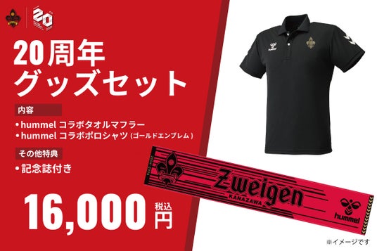 20周年グッズセット20周年ユニフォームと同じゴールドワッペンを使用したhummelコラボポロシャツと、20周年ユニフォームのデザインを踏襲したhummelコラボタオルマフラー、さらに記念誌付き。