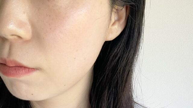色の補正があるわけではなく、馴染ませると素肌の色味のままなのですが、潤いやツヤがプラスされて、肌がキレイに見えるのがわかります。