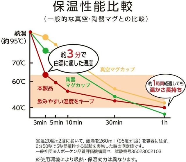 「白湯専科マグカップ」は、独自で配合した吸熱剤が、飲みものの温度をあっという間に下げて飲みやすくしてくれるんです。沸騰させた熱いお湯を注いでから約3分ほどで60〜65度まで下がります。