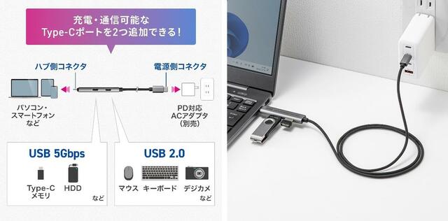 USBハブとType-Cケーブルの一体化によって、接続機器を充電しながらポートを増設。充電しない場合は、ACに接続せずハブとしても利用できます。
