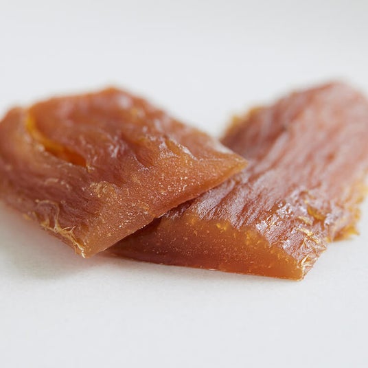 一般的な干し芋が薄い黄金色なのに対し、秦泉寺さんの干し芋は、深く黒みを帯びた飴色が特長です。