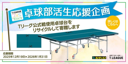 Tリーグでは、これまで行ってまいりました卓球部活生応援の一環として、リーグ卓球台サプライヤーの株式会社三英様のご協力のもと、全国の中学校、高等学校の卓球部の皆さんを選考対象として、ノジマTリーグ 2025-2026シーズンで使用した卓球台天板に、新たに脚をつけた卓球台1台を寄贈いたします。