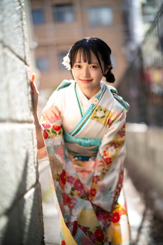 四期生の稲熊ひなは、浅草を舞台に印象的な白の振袖を纏って撮影。遊園地に行って射的を楽しんだり、おでんや揚げ饅頭を食べたり楽しく散策しながら、まだあどけなさの残る20歳の一瞬を切り取った。