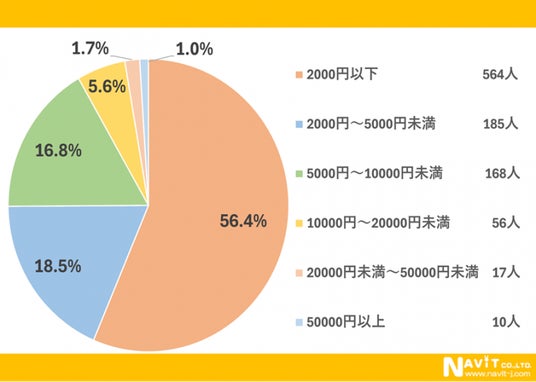 クリスマスの楽しみであるプレゼントの予算についてのアンケートです。最も多かった回答は「2000円以下」で56.4%。続いて「2000円~5000円」が18.5%、3番目が「5000円~10000円」で16.8%という結果になりました。費用を抑えつつ、いかに相手が喜んでくれるものをあげられるかがキモとなりそうです。