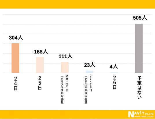 クリスマスのお祝いをするタイミングについてのアンケートを複数回答可で実施しました。結果、お祝いするひとと人とお祝いの予定がない人でおおよそ半々で、お祝いをする人の中ではクリスマスイブである「24日」が最も多い304人という結果になっています。