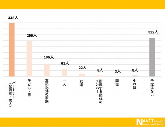 クリスマスを共に過ごす人についてのアンケートです。こちらも複数回答でいただきました。一番多かったのは「パートナー(配偶者・恋人)」で448人、次に多かったのは「子ども・孫」で299人、3番目が「左記以外の家族」で106人という結果になりました。家族で過ごすという方がかなりの割合を占めることが分かります。