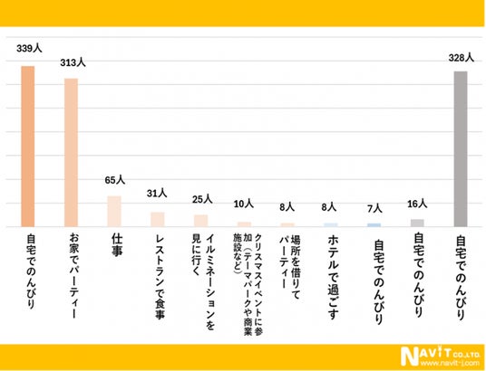 クリスマスの予定についてのアンケートも複数回答にていただきました。最も多かったのが「自宅でのんびり」で339人、そして「お家でパーティー」が313人と、自宅で過ごす人が多いことが分かる結果となりました。
