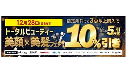 ビックカメラは12月12~28日の期間、指定メーカーの美容家電をまとめて購入すると、最大10%おトクになる「トータルビューティー 美顔×美髪フェア」を「ビックカメラ」の美容家電取り扱い全店および公式オンラインショップ「ビックカメラ・ドットコム」にて開催している。
