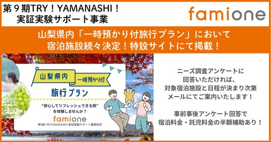 「子どもを願うすべての人によりそい 幸せな人生を歩める社会をつくる」をビジョンに掲げ、法人の従業員向け福利厚生や自治体の住民向け支援を行うヘルスケアサポートサービス「ファミワン」 https://famione.com/benefit/などを展開する株式会社ファミワン(本社:東京都渋谷区、代表取締役:石川勇介)は、山梨県(知事:長崎幸太郎)が実施する、山梨県全域を対象にした実証実験を全面的にサポートする「第9期TRY!YAMANASHI!実証実験サポート事業」に採択されています。