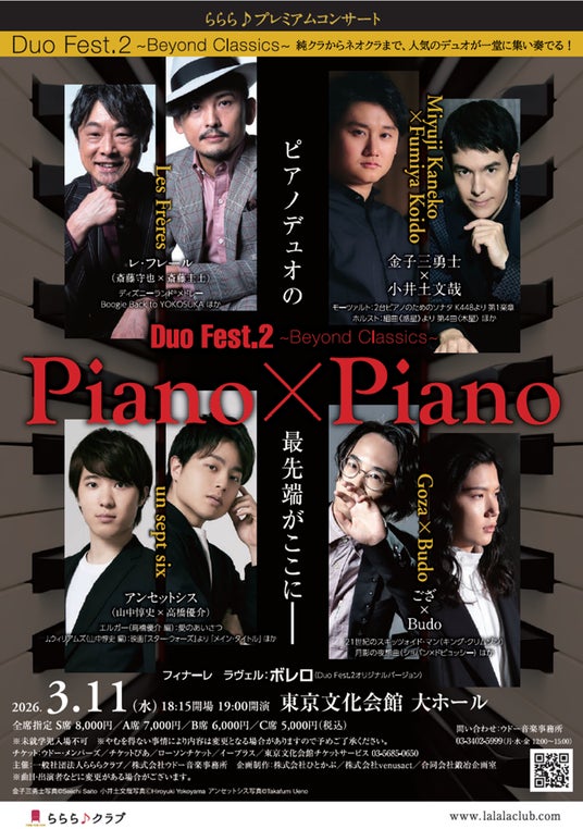 『Duo Fest.』は、~Beyond Classics~をテーマに、純クラからネオクラまで、人気のデュオが一堂に集うフェスティバル企画。今年11月12日に、DOS DEL FIDDLES with 妹尾武、水谷晃×TAIRIK、成田達輝×LEO、佐藤晴真×小林海都の4組が出演して開催されました。その第2弾『Duo Fest.2』は人気ピアノデュオ4組が登場。連弾で、2台で、一夜限りのピアノデュオの最先端を響かせます。12月20日からチケット一般発売開始。クラシックコンサートを主催し、クラシックWEBマガジンを運営する「らららクラブ」の『ららら♪プレミアムコンサート』としてお届けします。