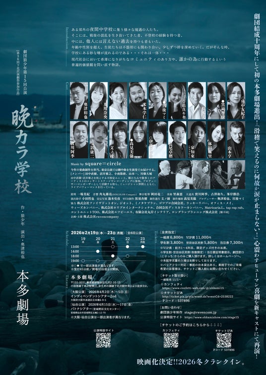 劇団第十五回目の公演となる『晩カラ学校』は、2026年2月19日(木)~2月23日(月・祝)、第36回下北沢演劇祭参加作品として本多劇場(東京都 世田谷区 北沢 2-10-15)にて上演。東京公演後は、大阪・仙台を巡る全国3都市ツアー公演も決定している。