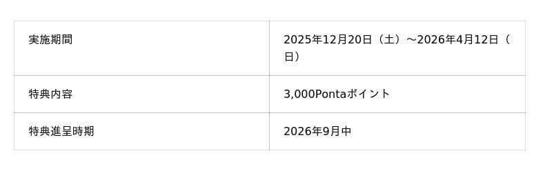 対象期間中に「東電ガス とくとくガスプラン for au」にお申込みいただいたお客さまには、特典として3,000Pontaポイントを進呈します。今回のキャンペーンは、都市ガスの契約切替を検討される方に、魅力的なキャンペーンです。