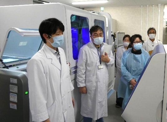 遺伝子・ゲノム融合推進検査室の機器を説明する青江副臨床検査技師長(左)