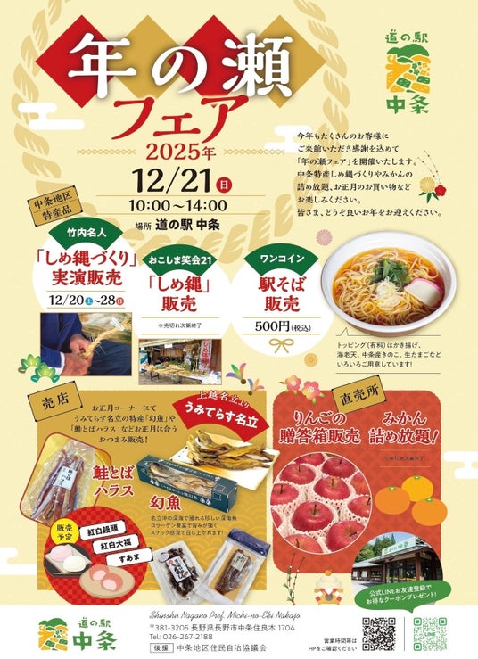 この度、長野県長野市中条にある道の駅 中条( 運営会社:eternal story株式会社 代表取締役:村上達哉)にて、2025年12月21日(日)に「年の瀬フェア2025」を開催いたします。