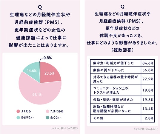 Q. 生理痛などの月経随伴症状や月経前症候群(PMS)、更年期症状などの女性の健康課題によって仕事に影響が出たことはありますか。/ Q. 生理痛などの月経随伴症状や月経前症候群(PMS)、更年期症状などの体調不良があったとき、仕事にどのような影響がありましたか。(複数回答可)