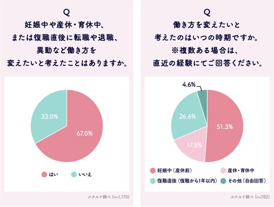 Q. ここからは妊娠・出産と女性のキャリアについてお伺いします。妊娠中や産休・育休中、または復職直後に転職や退職、異動など働き方を変えたいと考えたことはありますか。/ Q. 働き方を変えたいと考えたのはいつの時期ですか。※複数ある場合は、直近の経験にてご回答ください