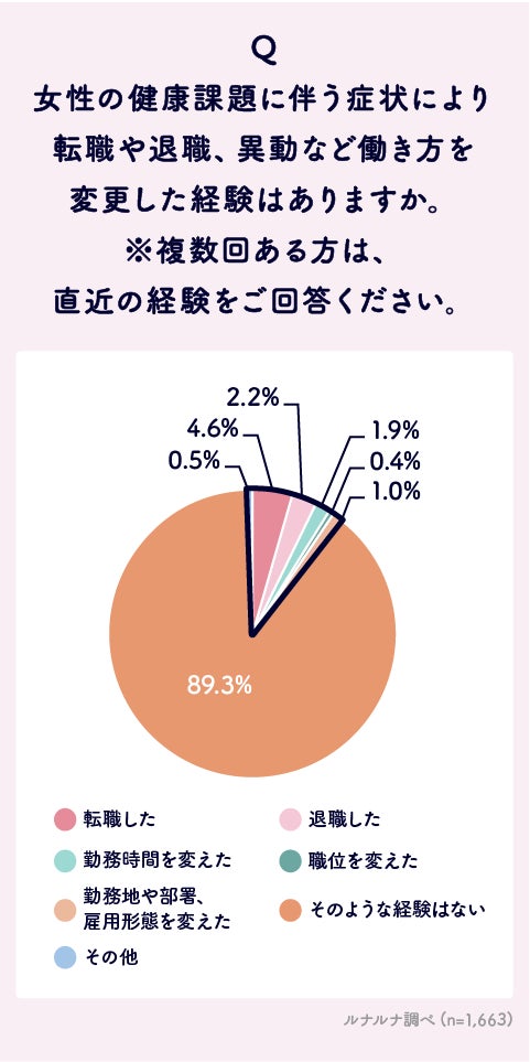 「そのような経験はない」が最も多く、89.3%となり、「転職した」割合は、4.6%、さらに「退職した」割合は2.2%、「勤務時間を変えた」割合は1.9%となりました。