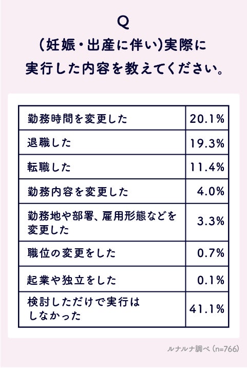 詳しく見てみると、実行した内容としての1位は「勤務時間を変更した」20.1%、2位は「退職した」19.3%、3位に「転職した」11.4%が並びました。非正規雇用の場合は約4割が退職を選んでいます。