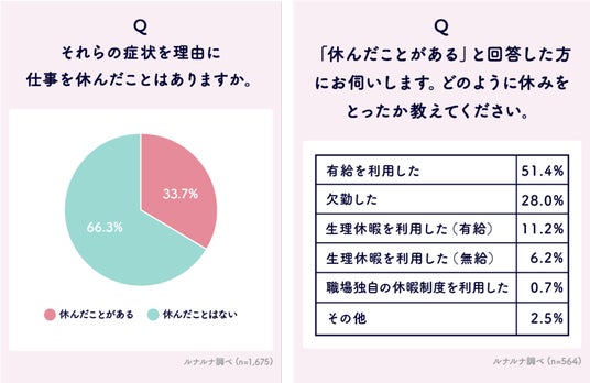 働く女性の多くが健康課題によって仕事に影響が出ていると回答していますが、そういった症状があるときに仕事を休んだことがあると回答した人は33.7%にとどまりました。大半が、仕事への影響を感じながらも休むという選択肢をとっていないことがわかります。