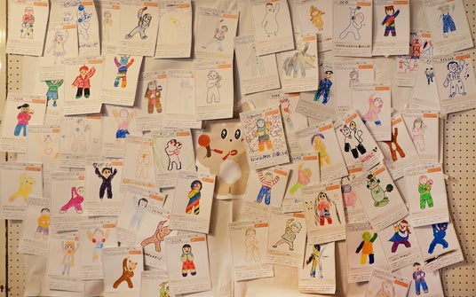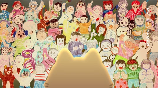 丸森町の夏祭り「齋理幻夜」のワークショップ参加者が描いた、ステージに立つねこがみを応援する観客イラスト
